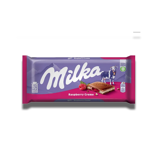Share a sweet treat from Lithuania with Milka Raspberry Creme chocolate bar. Made with alpine milk and raspberry creme for a creamy and fruity flavor, it's sure to satisfy any sweet tooth. Enjoy this delicious bar now!