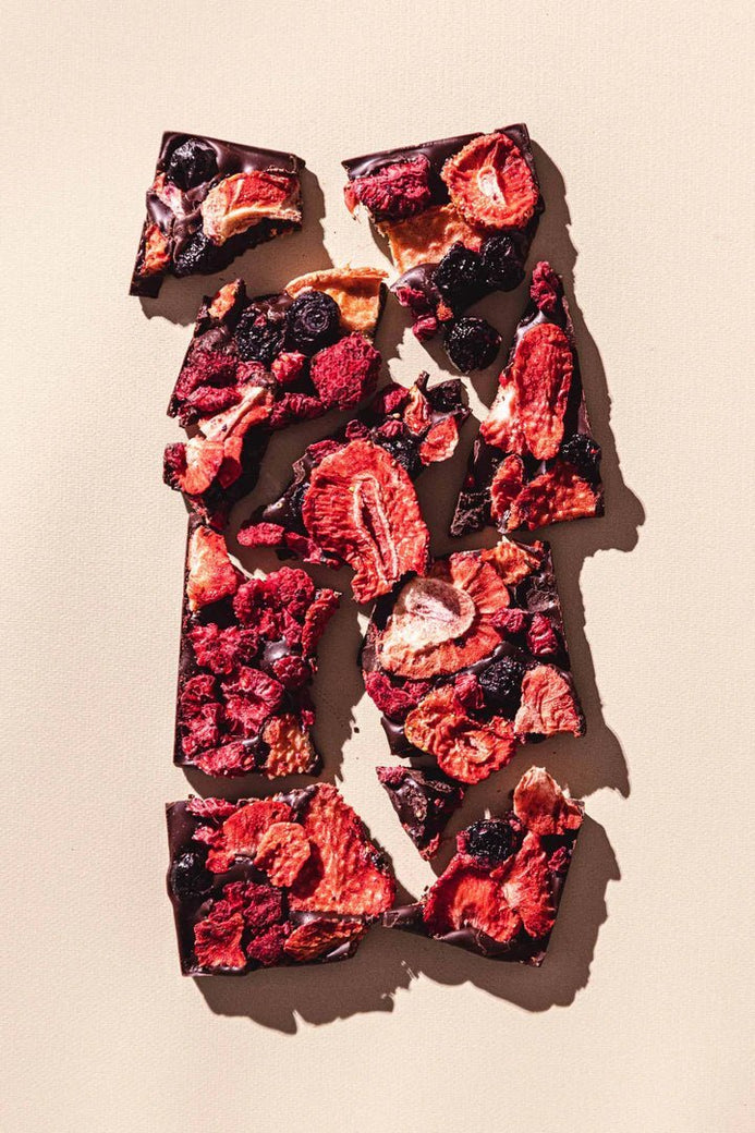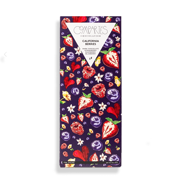 Compartés California Berries bar dark chocolate bar brings you the taste of spring with every bite. A deep dark chocolate studded with all natural dried strawberries, raspberries and blueberries. The most beautiful berry bar you'll ever see... and eat!  Compartés California Berries was Handmade in Los Angeles chocolate kitchens.