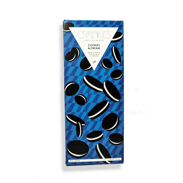 Compartés Cookies & Cream chocolate bar is unbeatably delicious! Using our new proprietary blend of white and dark chocolate, packed full of sandwich cream cookies, this chocolate bar may be our favorite chocolate creation yet! You must try this unique bar! Compartés Cookies & Cream was Handmade in Los Angeles chocolate kitchens.