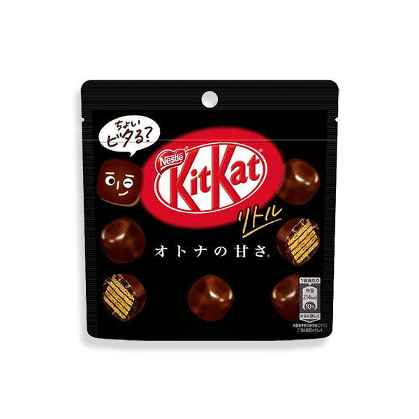 Otona No Amasa means “sweetness for adults.” This KitKat is a less sweet dark chocolate version of the regular KitKat. It's supposed to be 'only for adults' because of its slightly bitter flavor. Try this Kit Kat Bites Otona No Amasa and see what they taste like. Best Before Date: ***05/2023***