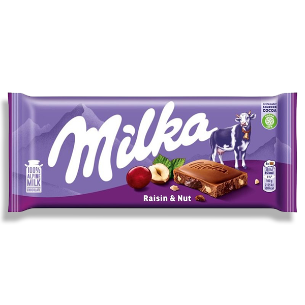 Milka Raisin & Nut from Switzerland is a great addition to your snack shelf but won't last long. Try this Milka Raisin & Nut made from Alpine Milk Chocolate and see what you have been missing out on!