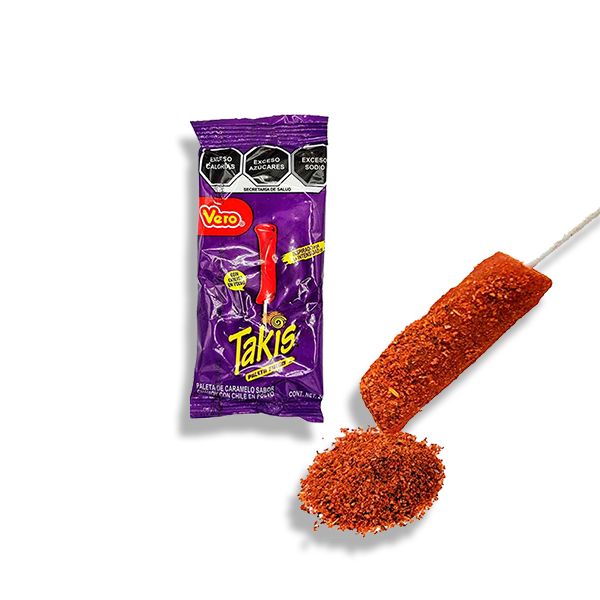 Takis Fuego Lollipop is a unique combination of a Vero chamoy flavored lollipop with hot and spicy chili powder inspired from Takis signature Fuego flavor for candy that delivers an intense candy!