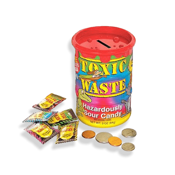 Toxic Waste Sour Candy Tye Dye is a must try, so grab one because it won't last long. But wait, it comes with free stickers and a reusable can as a coin bank. Try this Toxic Waste Sour Candy Tye Dye and see what you have been missing out on!