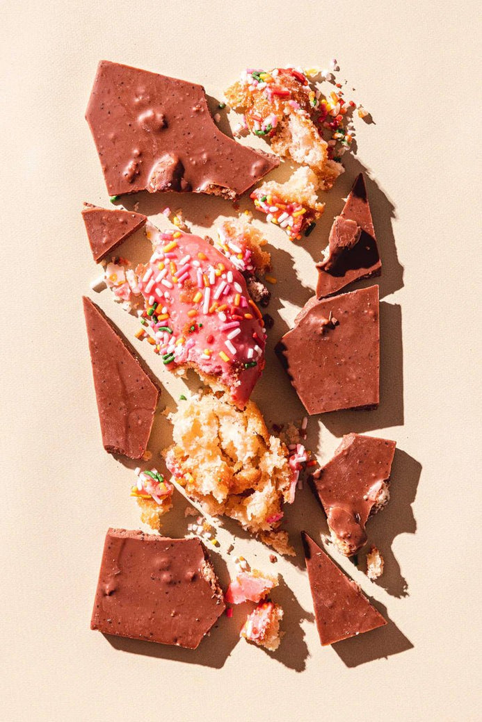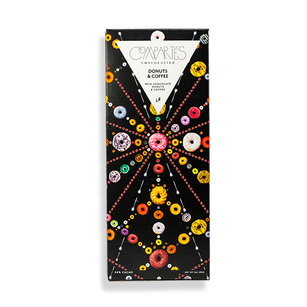 Donuts & Coffee chocolate bar features donuts from the best Los Angeles donut shops. Breaking the donuts up and mix them into the most creamy delicious milk chocolate you will ever taste. Add in coffee grounds from some of LA's best coffee shops and you've got yourself a winner! Compartes Donuts & Coffee chocolate bar features a geometric stylish pattern made from donuts and coffee on the custom box of gourmet and delicious chocolate bar! Handmade in our Los Angeles chocolate kitchens.