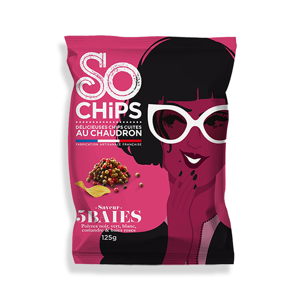 So Chips 5 Berries flavor potato chips from France is ready to leave your mouth speechless. Try So Chips 5 Berries chips today flavored with 5 Berries (black, green and white peppers, coriander, pink berries and see for yourself what you have been missing out on!